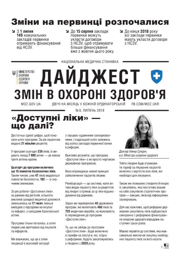 Дайджест змін в охороні здоров’я 8 Дата публікації: 03 Липня 2018 року. Опубліковано в Реформа МОЗ. « Назад Вперед »